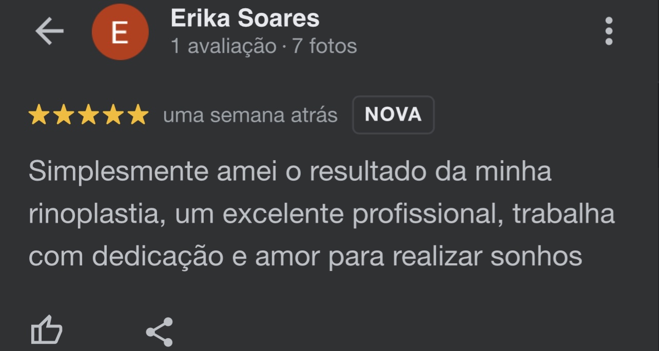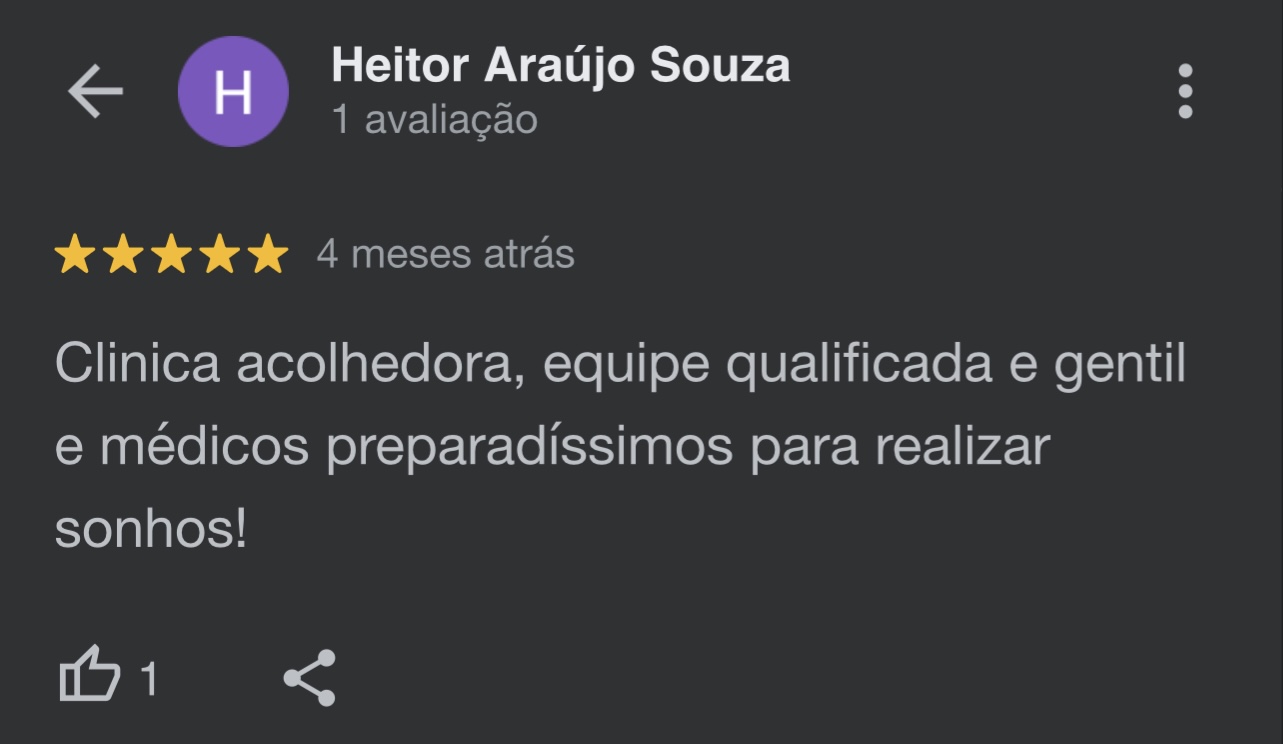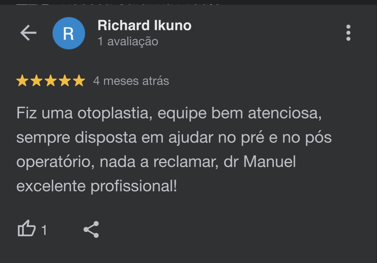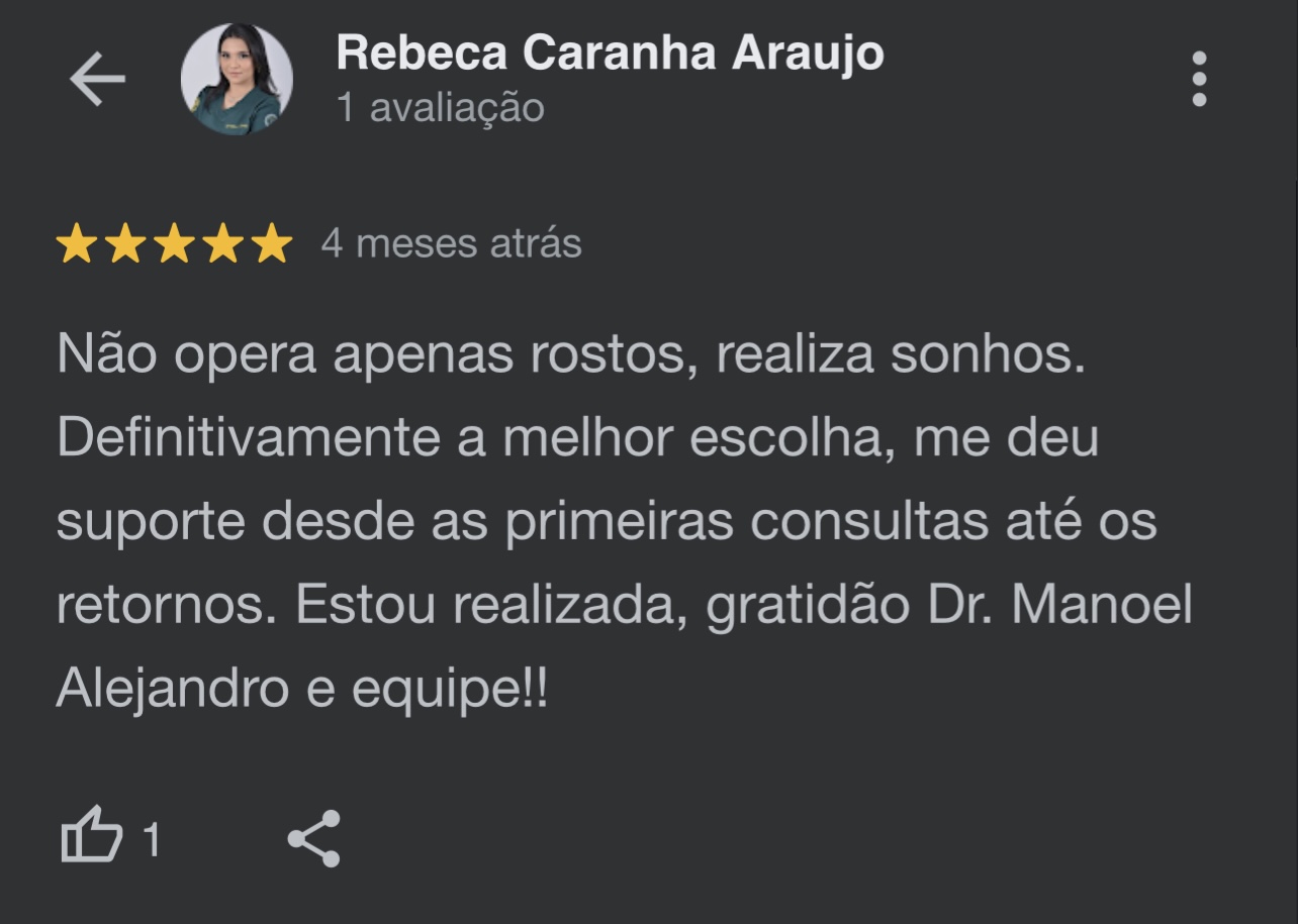 EXCELENTE Com base em 13 avaliações Catharine Lopes2023-09-12 Atendimento de excelência e qualidade! Confio de olhos fechados Neovision Systems2023-09-08 So recomendações positivas, principalmente no meu pós operatório, equipe Muito capacitada e atenciosa Erika Soares2023-08-04 Simplesmente amei o resultado da minha rinoplastia, um excelente profissional, trabalha com dedicação e amor para realizar sonhos Marcelo Morais2023-05-21 4 meses se passaram após a rinoplastia e muita coisa mudou: Minha auto estima melhorou 100%; Sensação de receio; vergonha; pouca disposição pra falar em público; me manisfestar; me expor… ( nada disso existe mais) Msm com todo buling que sofri ao longo de 19 anos, mesmo com o trauma de infância; é como se simplesmente uma borracha fosse passada no passado. Obg, por todo seu empenho e de seu pai, obg pela dedicação que têm em mudar definitivamente a vida das pessoas🙏🏻. Emilly Vasconcelos2023-05-19 Fiz minha rino secundário com ele, simplesmente perfeito! Manuel e seu pai arrasam nas cirurgias Rebeca Caranha Araujo2023-04-04 Não opera apenas rostos, realiza sonhos. Definitivamente a melhor escolha, me deu suporte desde as primeiras consultas até os retornos. Estou realizada, gratidão Dr. Manoel Alejandro e equipe!! Heitor Araújo Souza2023-04-04 Clinica acolhedora, equipe qualificada e gentil e médicos preparadíssimos para realizar sonhos! Lanny Barroso2023-04-04 Atendimento nota 1000. Jovem médico educado e muito profissional, extremamente capacitado realizando Sonhos, com suas técnicas inovadoras. Stephaniebarroso16@gmail.com Stephanie2023-04-04 Cirurgião de confiança, com resultados perfeitos! Indico demais! Richard Ikuno2023-04-04 Fiz uma otoplastia, equipe bem atenciosa, sempre disposta em ajudar no pré e no pós operatório, nada a reclamar, dr Manuel excelente profissional!
